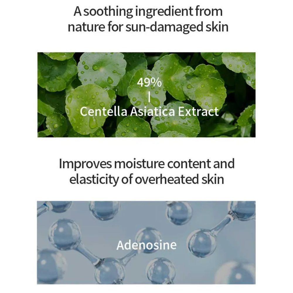 Une crème solaire apaisante SPF 50+ PA++++ formulée avec 49 % d’extrait de Centella Asiatica pour calmer et protéger la peau. Enrichie en bêta-glucane et adénosine pour hydrater et lisser les rides. Sa texture légère et non parfumée pénètre facilement et laisse une finition naturelle, non collante et sans trace blanche — idéale pour un usage quotidien.