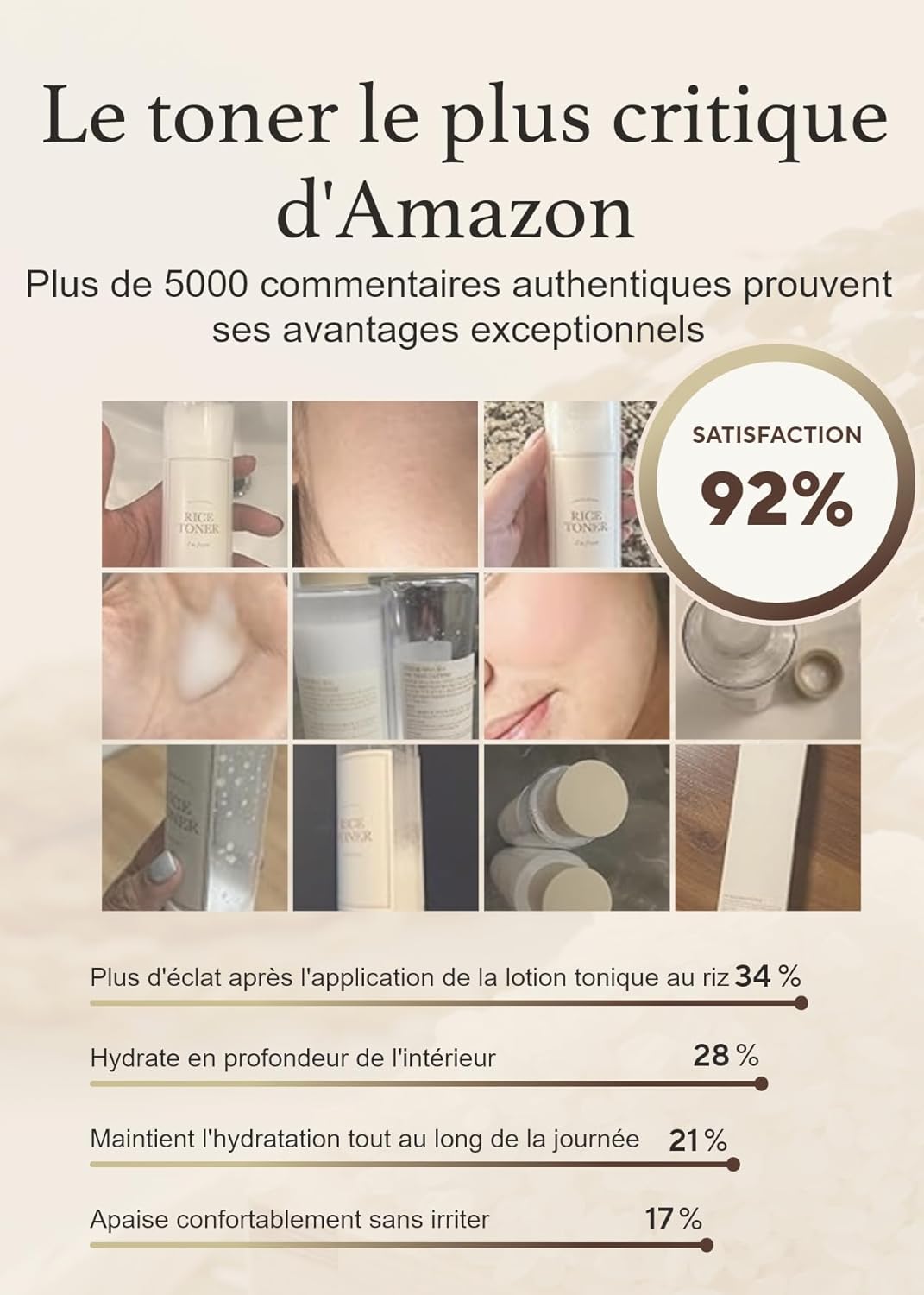 La formulation avant-gardiste d'I'm From Rice Toner associe les bienfaits du riz goami aux extraits de son de riz, d'amaranthus caudatus et de portulaca oleracea. Cette synergie d'actifs agit simultanément pour nourrir, apaiser et illuminer la peau tout en luttant contre les signes de l'âge. Sa formule délicate convient parfaitement aux peaux les plus sensibles.